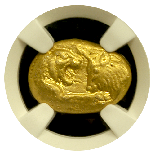 向き合うライオンと雄牛の前半身、ライオンの右手が雄牛をつかもうとしている/陰刻 古代リディア王国クロイソス王期(561~546BC)が世界で最初にコインを発行したと云われ、ヘロドトスが著作「歴史」で述べたように世界初の貨幣として名高い。この金貨はバビロニアスタンダードの1スターテル(10.09g)とオイボエア・スタンダードの1スターテル(8.09g)の2タイプに分類される。