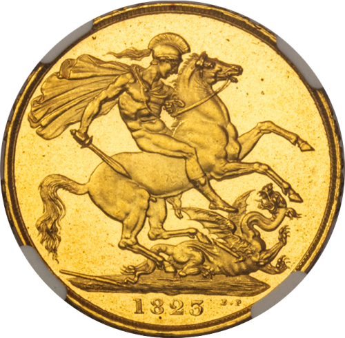 1823年ジョージ4世の2ポンド金貨になります。MS鑑定はNGCで144枚ありますが、MSのプルーフライク鑑定はわずか8枚でMS63+はトップで一枚しかありません。唯一無二の存在です。