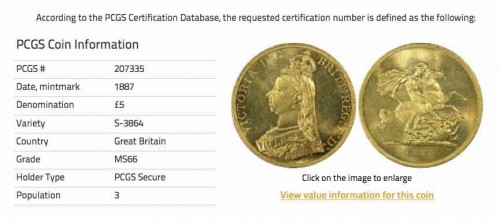 1887年英国ヴィクトリア女王5ポンド金貨の最高鑑定のご紹介です。存在数わずか3枚。将来性抜群の1枚です。NGC鑑定もMS66が最高鑑定で存在数2枚ですのでPCGS, NGC合わせても5枚しか存在しません。1887年ヴィクトリア金貨は世界を代表する金貨。その最高鑑定を手にいれる滅多とないチャンスです。この機会をお見逃しなく!