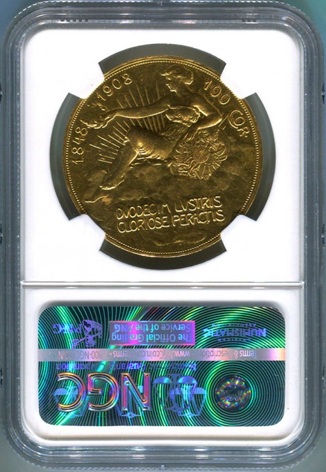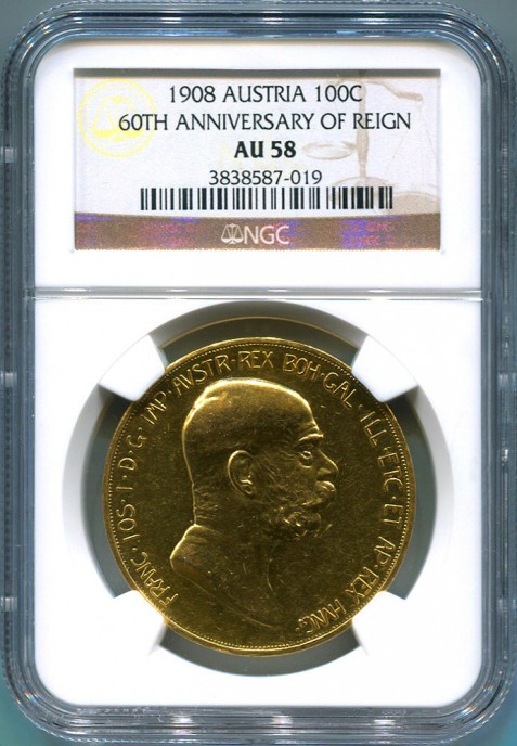 1908年オーストリア100コロナ金貨 雲上の女神 NGC AU58