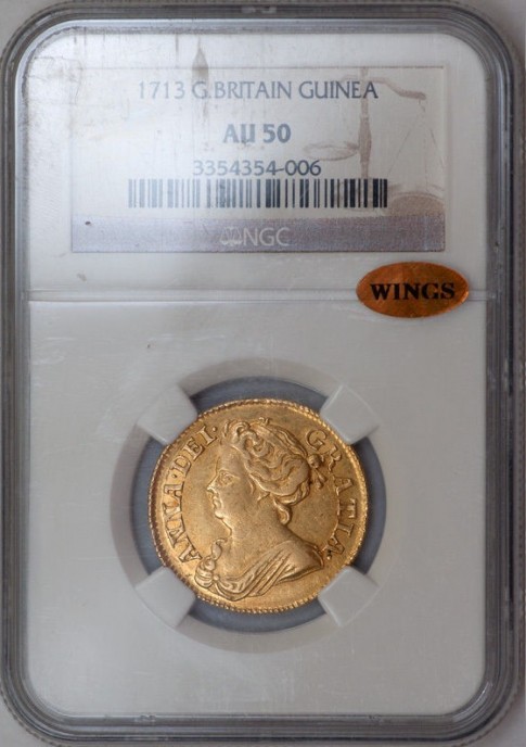 アン女王のギニー金貨です。NGC AU50 + WINGSのついたレアな一枚です。EFで80万円ほどの価値がございますので割安な価格でご提供です。年々人気が高まるアン女王の金貨です。是非この機会をお見逃しなく!