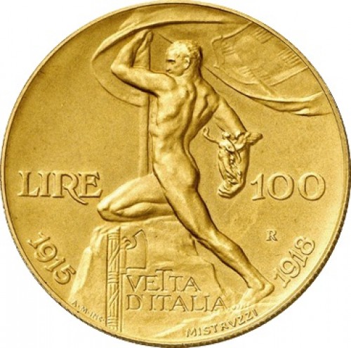 1925年 100リラ金貨 リレ ヴィットリオ エマヌエレ3世 統治25周年 第1次世界大戦10周年 マットプルーフ金貨です。女神や女王のデザインが多いですが、このコインは男性の肉体美をあしらった珍しいコインです。