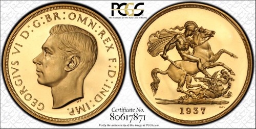 1937年英国ジョージ六世5ポンドプルーフ金貨 PCGS PR64 Deep Cameo (DCAM)