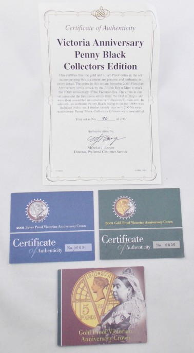 人気急騰で入手が困難になりつつあるヴィクトリア・アニバーサリー(ヴィクトリア 追悼100年記念)のセットです。わずか200セットしかありません。セットには5ポンドの金貨と銀貨の他に1800年代のペニーブラックの切手も付いてきます。また専用のシルバーケースも圧倒的な重厚感があり、その辺の安いケースとは全然違います。スペシャルセットのこだわりを感じます。金貨だけで鑑定付きだと5000ドルほどで売られていますのでこの価格でセットが買えるのはお買い得です。