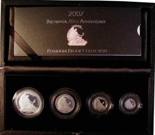 英国ブリタニア金貨や銀貨は有名ですが2007年に初めてプラチナコインが鋳造され発売されました。発売はわずか250セットのみで発売から数週間で完売となりました。コインセットは£100, £50, £20, £10の4枚です。