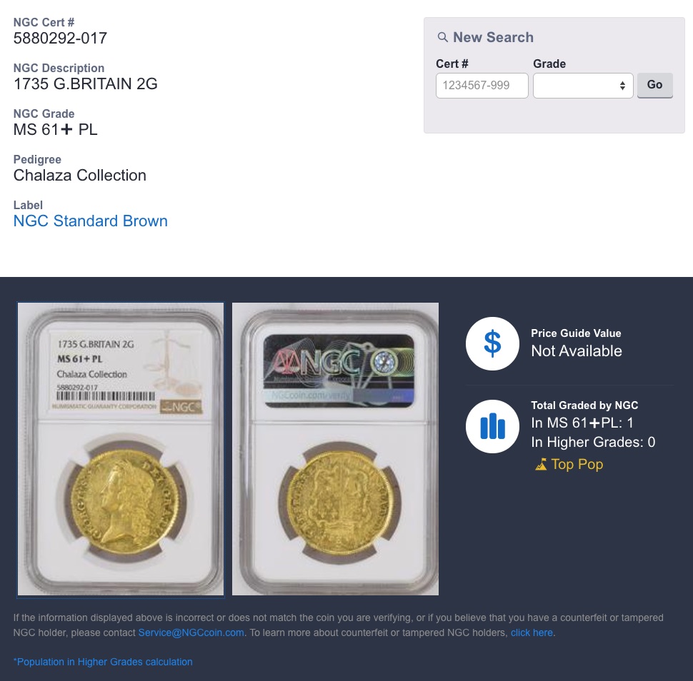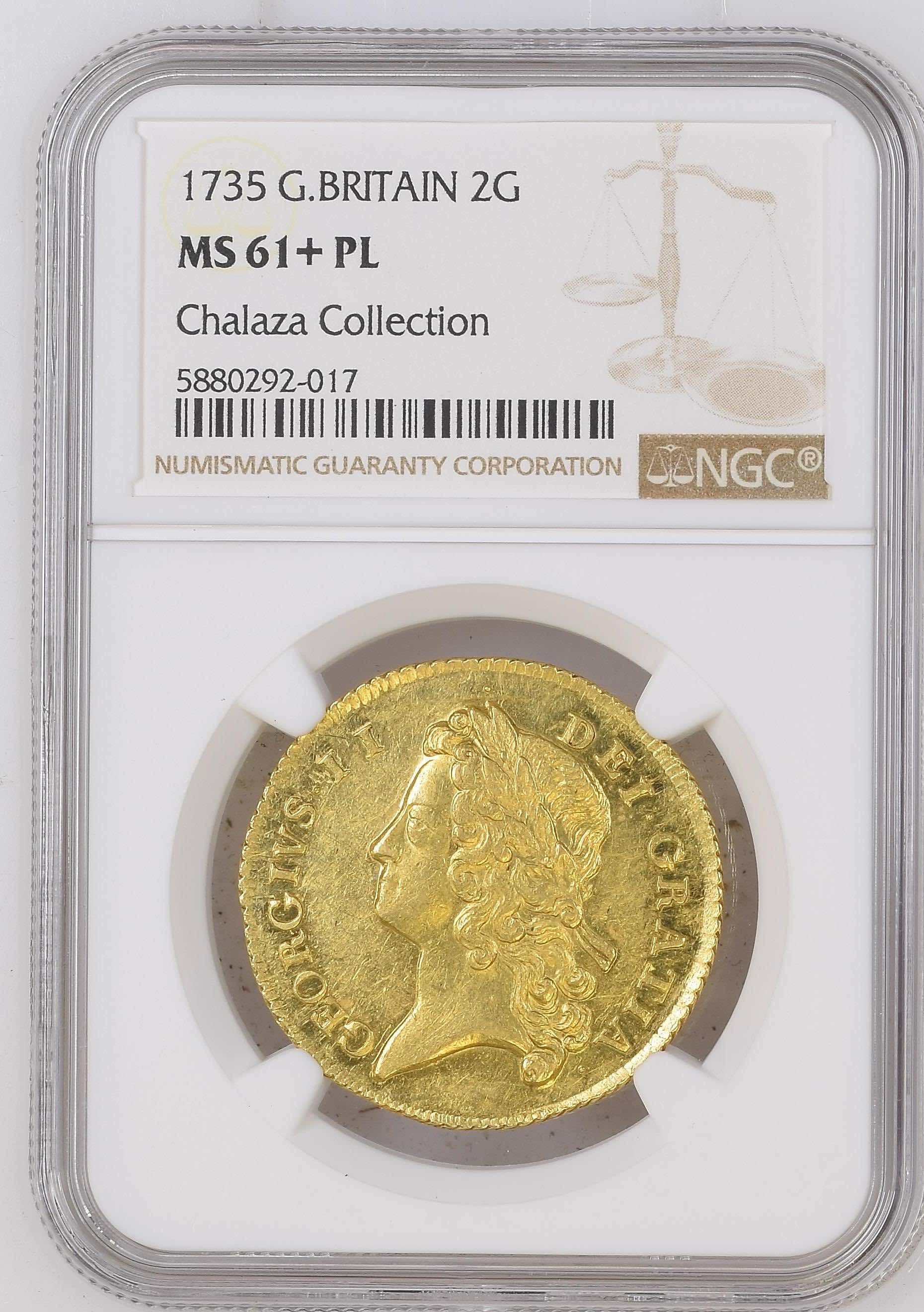 1735年イギリス ジョージ2世 2ギニー金貨 NGC MS61+PL