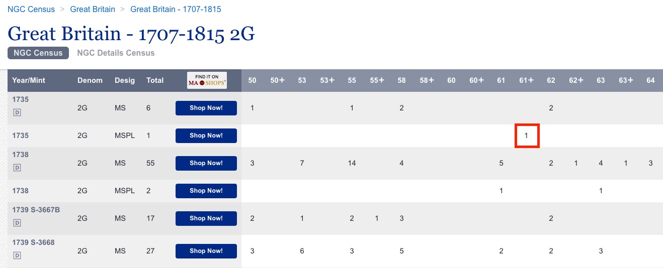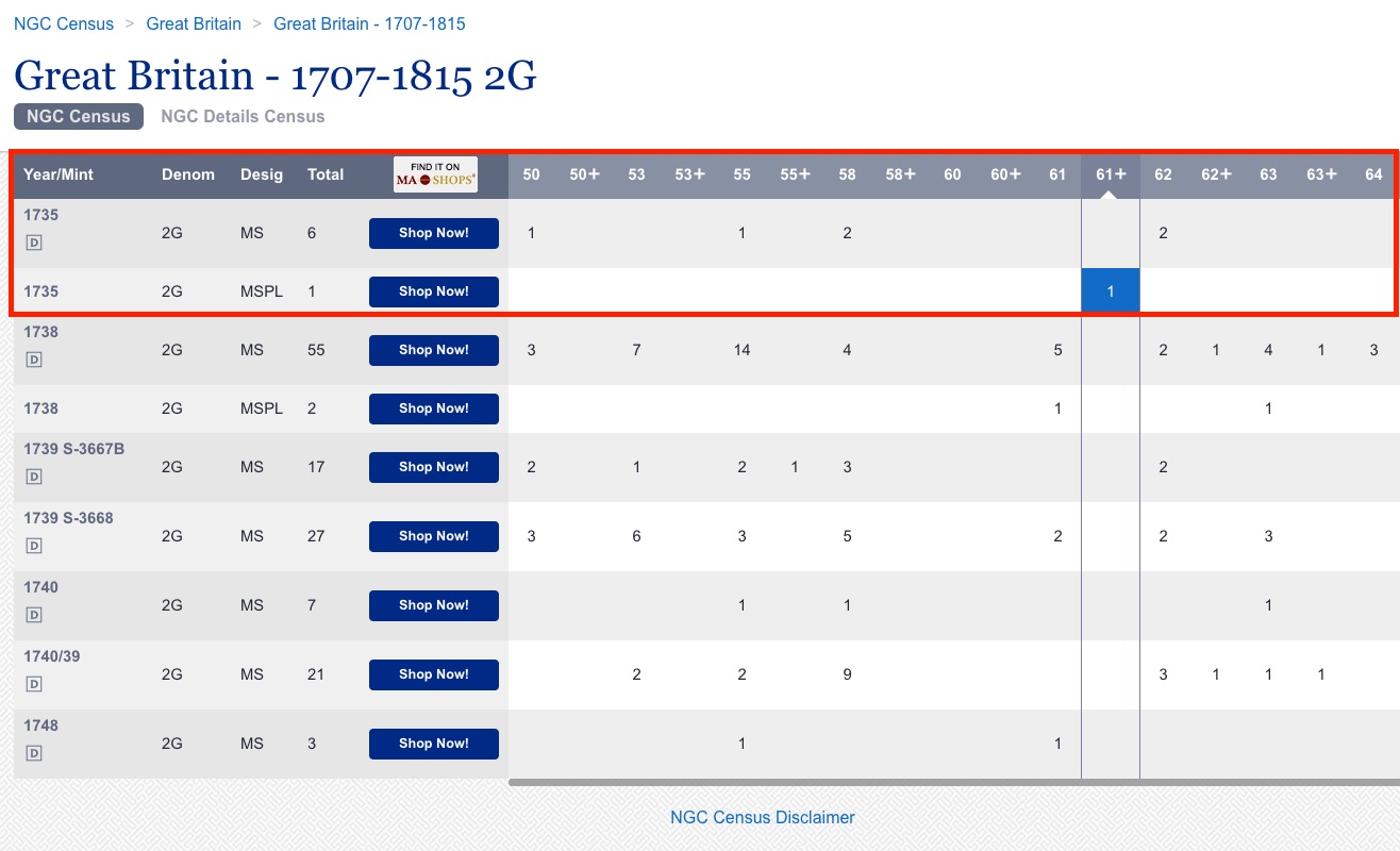 1739年は54枚。 (PCGSと合わせると 80枚)
