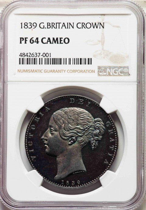 1847年銘 ゴチック・クラウン 表は王冠を戴く若い女王の胸像。裏は紋章を描いた4つの盾とシンボルの植物 プルーフ状態で8000枚鋳造。なお、ゴチッククラウンは1853年にも追加で460枚鋳造されている