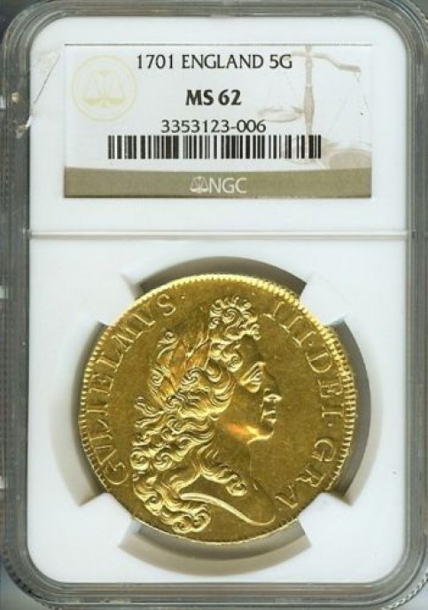 1701年英国ウィリアム3世5ギニー金貨 NGC MS62