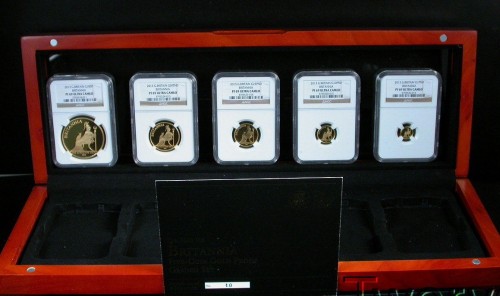 2013年のブリタニア プルーフ金貨5枚セットです。ブリタニアプルーフ金貨セットで5枚組は2013年のみです。1987-2012年まではすべて4枚組。デザインも有名な彫刻家のIan Rank-Broadley氏が担当。NGC PF69UCとほぼ完璧の鑑定です。