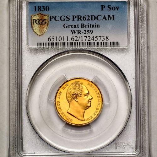1830年のソブリン金貨といえば通常はジョージ4世の図柄になります。このプルーフソブリン金貨は次の統治王のウィリアム4世の図柄です。試作貨(パターン貨)だからです。また肖像画には2つのバリエーションが存在しており、1つ目をFirst Bust, 2つ目のSecond Bustと呼びます。今回お譲りするのは試作貨でも初期の1つ目の肖像画タイプの WR-259 First Bust Plain Edgeです。Second BustのWR-260でもレア度がR5(6-9枚しか存在していないことを示します)です。WR-259はこれまでにこの一枚しか確認されておりません。(鑑定あり、なし含めて)これ1枚しか存在しない可能性が高いです。その昔このコインがオークションに出た際にもその旨が記載されております。ウィリアム4世シリーズのパータン貨として一番最初に造られた可能性があるため1枚のみの可能性が高いようです。