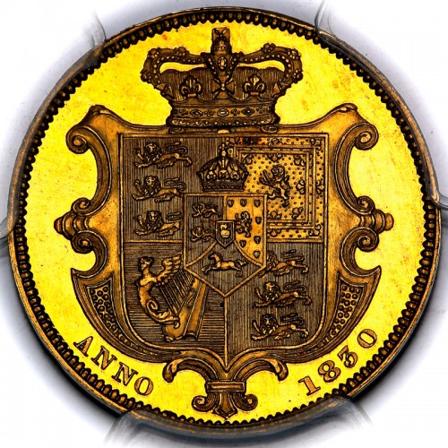 1830年のソブリン金貨といえば通常はジョージ4世の図柄になります。このプルーフソブリン金貨は次の統治王のウィリアム4世の図柄になります。理由はこのコインが試作貨(パターン貨)だからです。また肖像画には2つのバリエーションが存在しており、1つ目をFirst Bust, 2つ目をSecond Bustと呼びます。SpinkカタログにはSecond Bustの記載(Spink番号 3829B) がございますが、First Bust(Spink番号 3829) に記載がないことからこのコインのレア度がうかがえます。